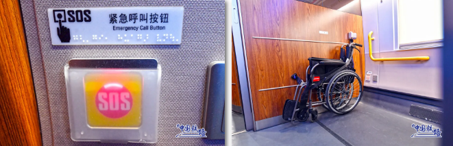 全列覆蓋免費高速Wi-Fi,旅客在旅行途中可以隨時使用電腦辦公、手機娛樂。車廂內設有大件行李存放處、無障礙衛(wèi)生間等設施,并在殘疾人座位區(qū)配備輪椅固定裝置、SOS按鈕等。