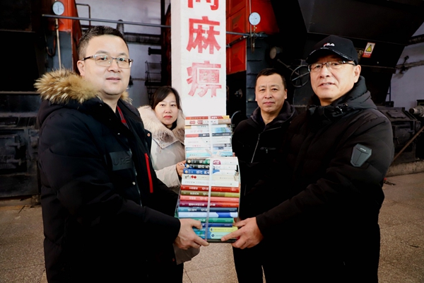 阿木爾林業(yè)局黨委委員、宣傳部部長高樹源(左一)為物業(yè)公司送書籍的精彩瞬間(王力 攝)