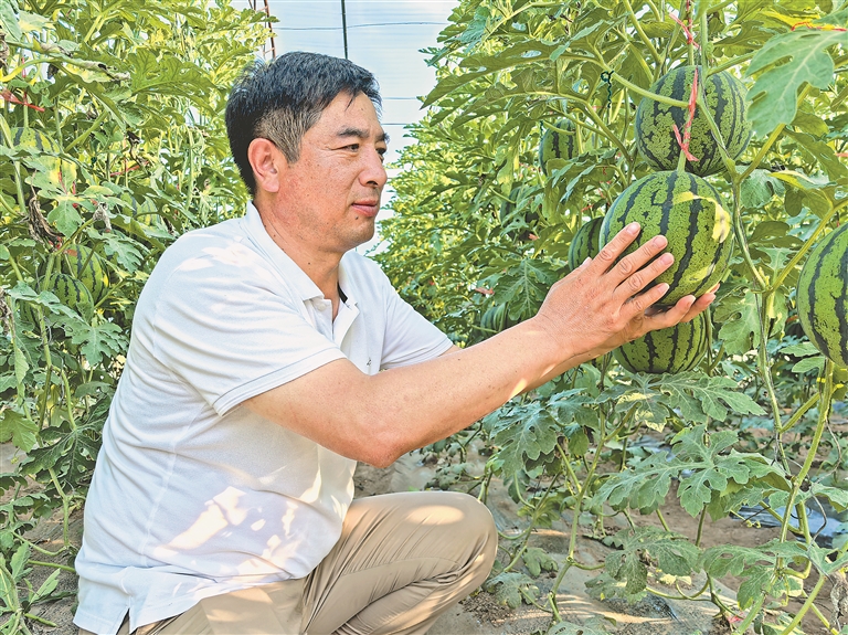 王喜慶在查看西瓜長勢。