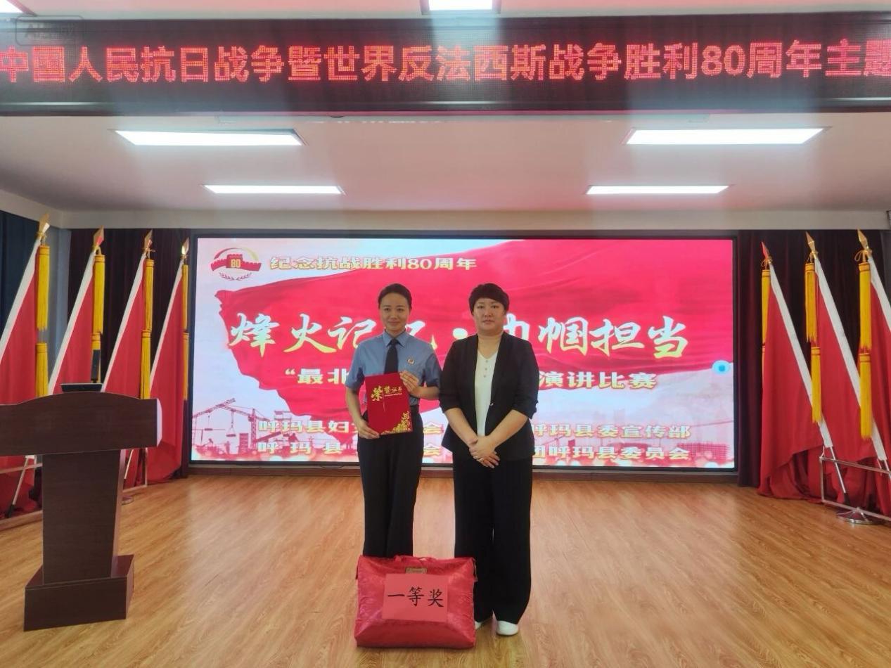經(jīng)過緊張激烈的預(yù)賽,呼瑪縣人民檢察院干警郭海萍脫穎而出進入總決賽。決賽現(xiàn)場,各位選手緊扣主題,立足崗位,以真摯的情感和激昂的語言,生動展現(xiàn)了新時代巾幗風采。她們深情回顧艱苦卓絕的抗戰(zhàn)歲月,弘揚革命先輩為國獻身的偉大精神;結(jié)合當下,暢談抗戰(zhàn)精神的時代傳承;展望未來,激勵廣大女性在新征程上踔厲奮發(fā)、勇毅前行,充分彰顯了新時代女性的使命與擔當。經(jīng)過激烈角逐,最終,郭海萍榮獲一等獎。