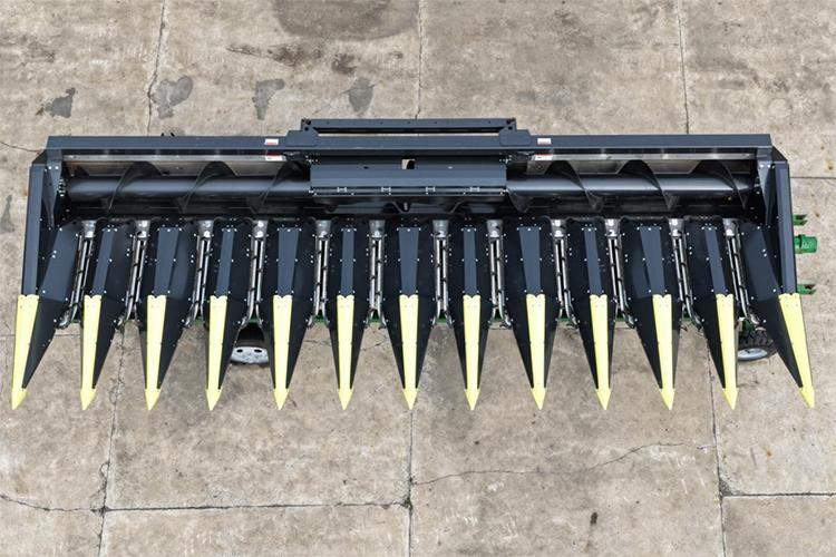 現(xiàn)場會上,最讓人駐足的是現(xiàn)場展示的意大利卓收割臺, 此次引入的卓收割臺,其自動摘穗板每行單元可實現(xiàn)自動開合且?guī)в袦p震功能,能根據(jù)玉米粗細靈活調(diào)節(jié)間隙,有效解決了其他品牌割臺無法對每行每株精準適配的問題;同時,收割臺的拉莖輥長度較其他品牌割臺增加 8 公分,讓割臺更貼合地面,在收獲倒伏玉米時作業(yè)角度更優(yōu),大幅減少 “跳棒” 現(xiàn)象。此外,卓收割臺的拉莖輥及刀片采用螺栓固定設計,可隨時調(diào)整位置或更換部件,避免了其他割臺因拉莖輥及刀片為一體式設計、損壞后需整體更換的弊端。
