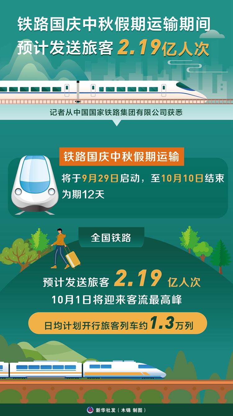 新華社北京9月28日電(記者樊曦)記者從中國國家鐵路集團(tuán)有限公司獲悉,鐵路國慶中秋假期運輸將于9月29日啟動,至10月10日結(jié)束,為期12天,全國鐵路預(yù)計發(fā)送旅客2.19億人次,10月1日將迎來客流最高峰,日均計劃開行旅客列車約1.3萬列。
