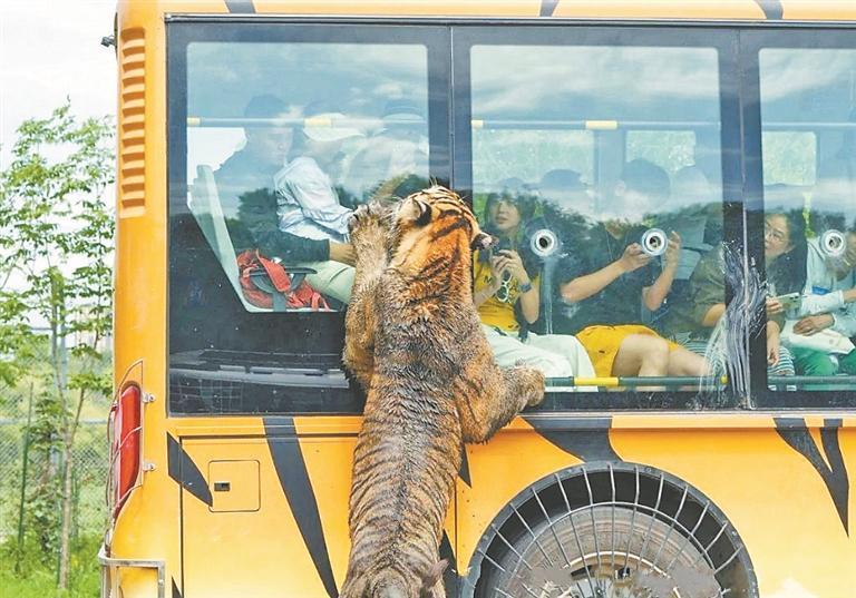 在驚險(xiǎn)觀光車上,游客可以通過(guò)特制裝置給成年虎投喂食物,體驗(yàn)“虎口投食”的刺激。“從來(lái)沒(méi)想過(guò)能這么近距離接觸東北虎,看著它從我手中的夾子吃肉,既緊張又激動(dòng)!”來(lái)自上海的大學(xué)生語(yǔ)氣難掩興奮。
