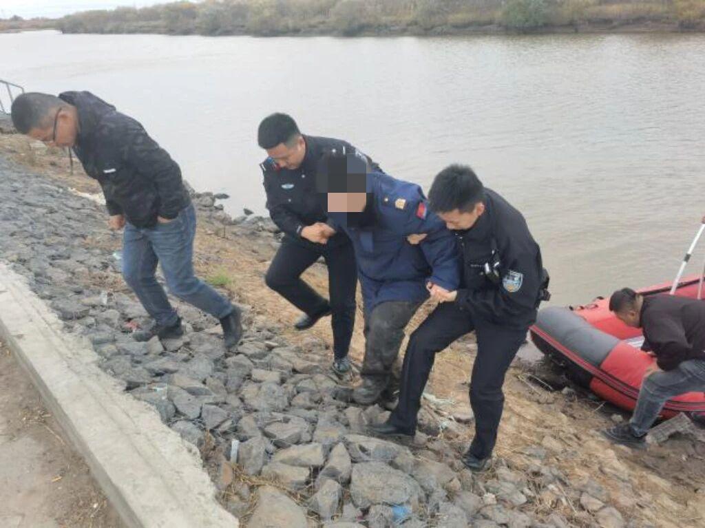 由于男子距離岸邊較遠,徒手救援難度極大。民警第一時間聯(lián)系情報指揮中心請求支援,同時聯(lián)動五大連池市應急管理局,同步告知現(xiàn)場情況,協(xié)助做好救援準備。在等待救援的間隙,民警始終趴在橋邊呼喊,持續(xù)與男子對話,穩(wěn)定該男子情緒。很快,救援力量抵達現(xiàn)場。民輔警立即協(xié)助專業(yè)救援人員駕上皮筏艇,快速向男子被困位置靠近。留在岸邊的民輔警則繼續(xù)喊話安撫,引導男子保持清醒,配合救援。共同協(xié)作下,男子被成功轉移至岸邊,民輔警合力將其拉上岸。上岸后,男子全身濕透、身體發(fā)抖,民輔警迅速將其扶上警車取暖。