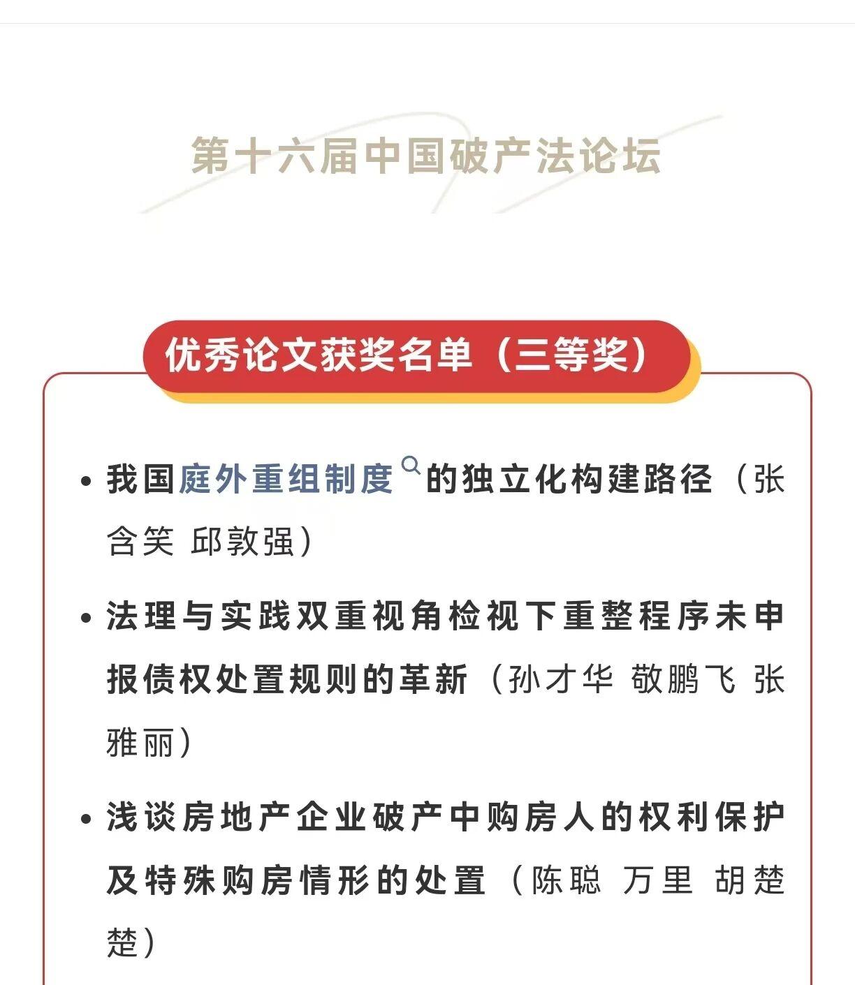 黑龍江經(jīng)濟(jì)網(wǎng)訊(董慧瑩 李雪松)近日,第十六屆中國破產(chǎn)法論壇在京舉辦。本屆論壇由中國人民大學(xué)法學(xué)院、中國人民大學(xué)破產(chǎn)法研究中心、北京市破產(chǎn)法學(xué)會(huì)、北京破產(chǎn)法庭共同主辦。經(jīng)過論壇組委會(huì)層層遴選及第三方專家評(píng)審,最終評(píng)出一等獎(jiǎng)58篇,二等獎(jiǎng)95篇,三等獎(jiǎng)127篇,優(yōu)秀獎(jiǎng)62篇。其中,肇東市人民法院黨組成員周麗華、立案庭法官助理李旭東、審管辦書記員王岳共同撰寫的論文《房產(chǎn)企業(yè)破產(chǎn)程序中預(yù)告登記法律效力研究》在1300篇論文中脫穎而出,榮獲三等獎(jiǎng)。