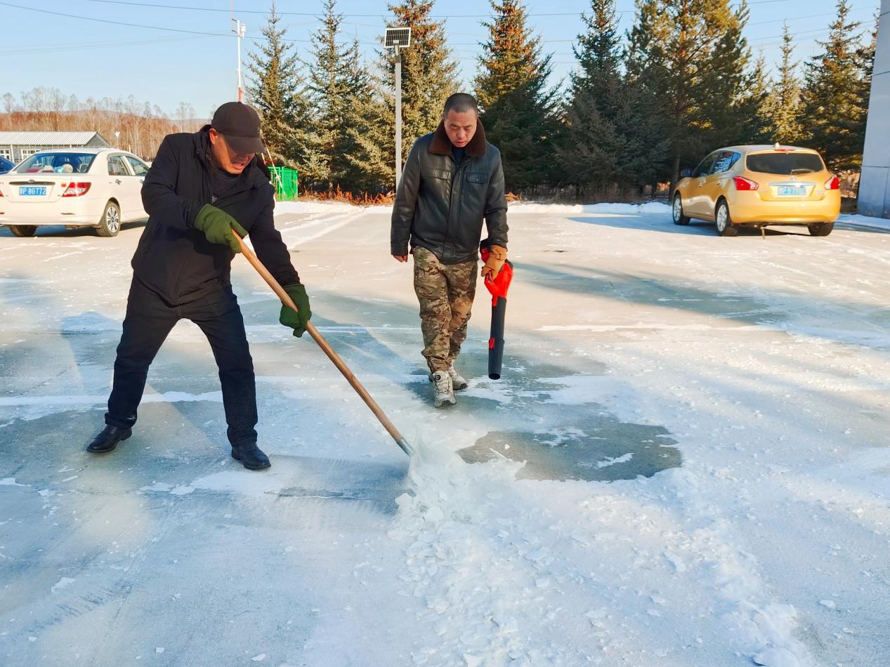 清雪現(xiàn)場(chǎng),干部職工們嚴(yán)格遵循“即下即清、雪停路凈”的原則,不畏凜冽寒風(fēng),迅速投入戰(zhàn)斗。大家分工協(xié)作,形成了“機(jī)械+人工”的高效清雪模式。職工們各展所長(zhǎng),有人駕駛自制清雪車清理積雪,有人用推雪板歸集散雪,還有人手持雪鏟、吹雪機(jī)細(xì)致清理人行道縫隙等邊角區(qū)域。經(jīng)過近3小時(shí)的奮戰(zhàn),林場(chǎng)責(zé)任區(qū)內(nèi)的積雪被清除干凈,露出了整潔的路面和暢通的通道,為職工群眾和過往車輛安全通行清出了一片“平安路”。