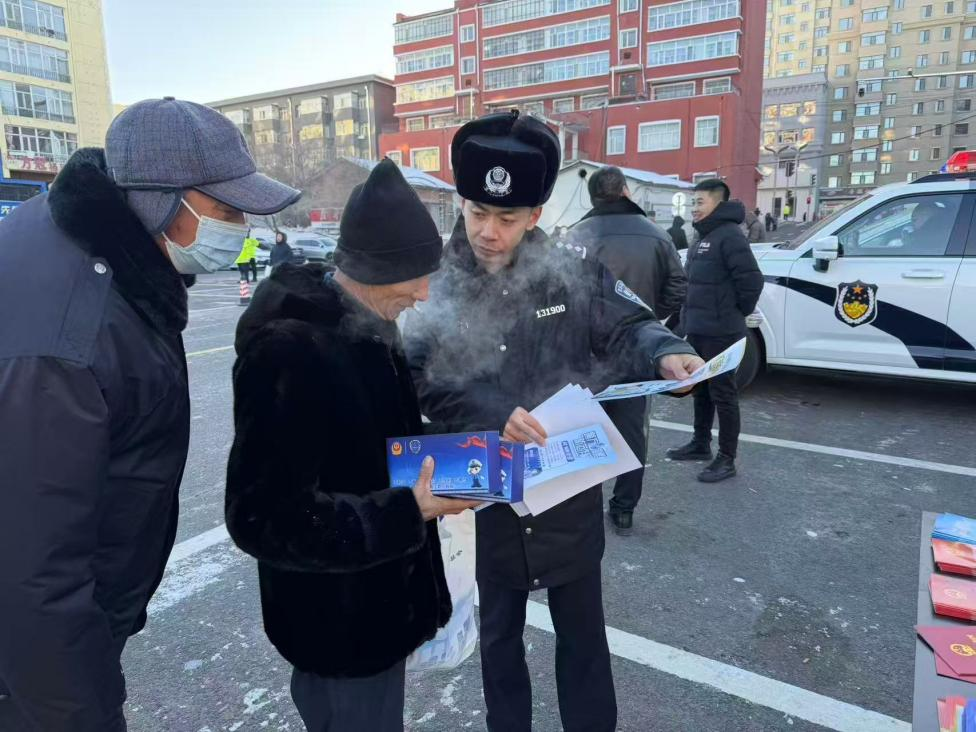 冰天雪地中,民輔警搓著凍紅的雙手仍微笑宣講,逐份發(fā)放《中華人民共和國憲法》讀本、法治折頁與防范指南。“這么冷的天還出來送法律知識,這些知識很實用,拿回去也讓家里人學學”,市民李大爺?shù)母锌莱隽巳罕娦穆暎F(xiàn)場咨詢、聆聽的群眾絡繹不絕,秩序井然。
